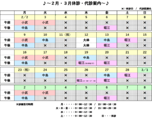 2026.02.12 2月・3月の休診・代診のおしらせ